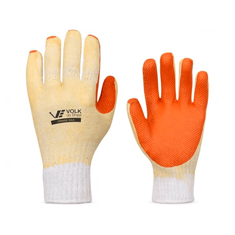 Orange Volk. Algodão Com Látex Vulcanizado, uma luva ideal para todo tipo de trabalho que exige proteção mecânica leve ou moderada como coleta de lixo, construção civil etc